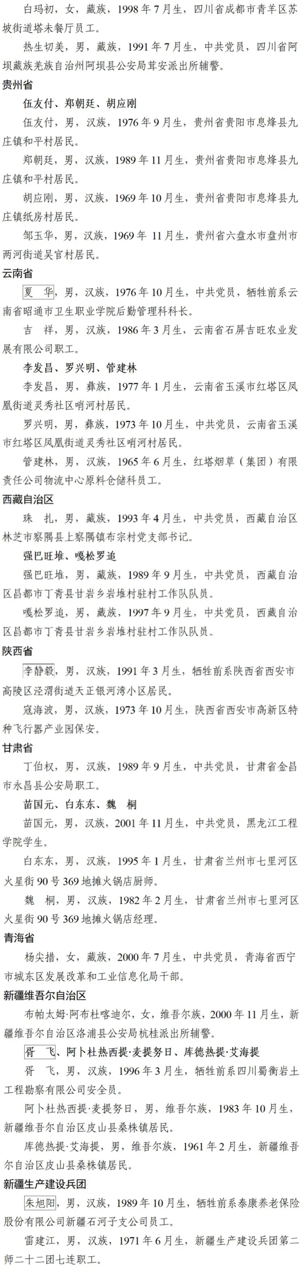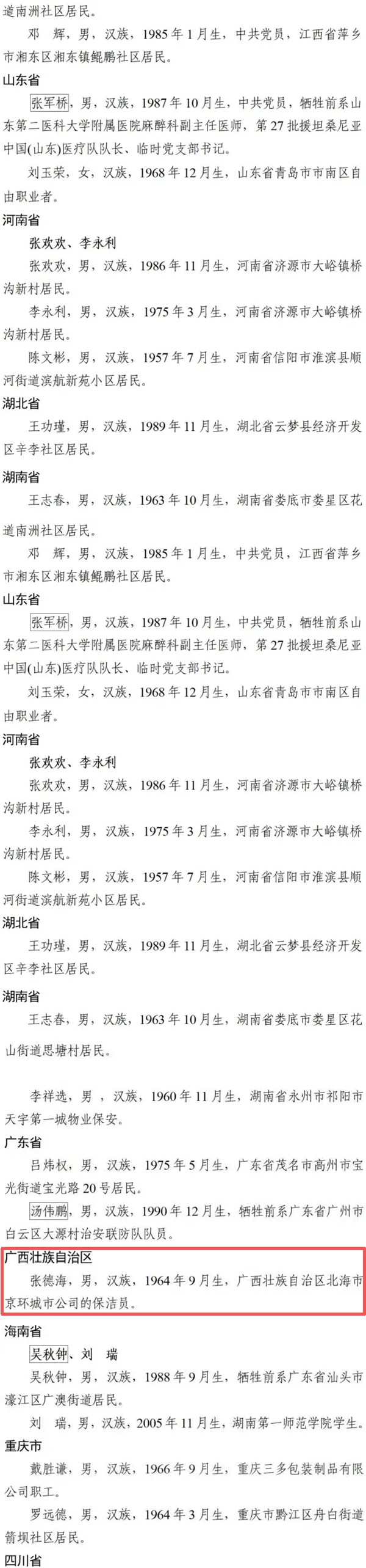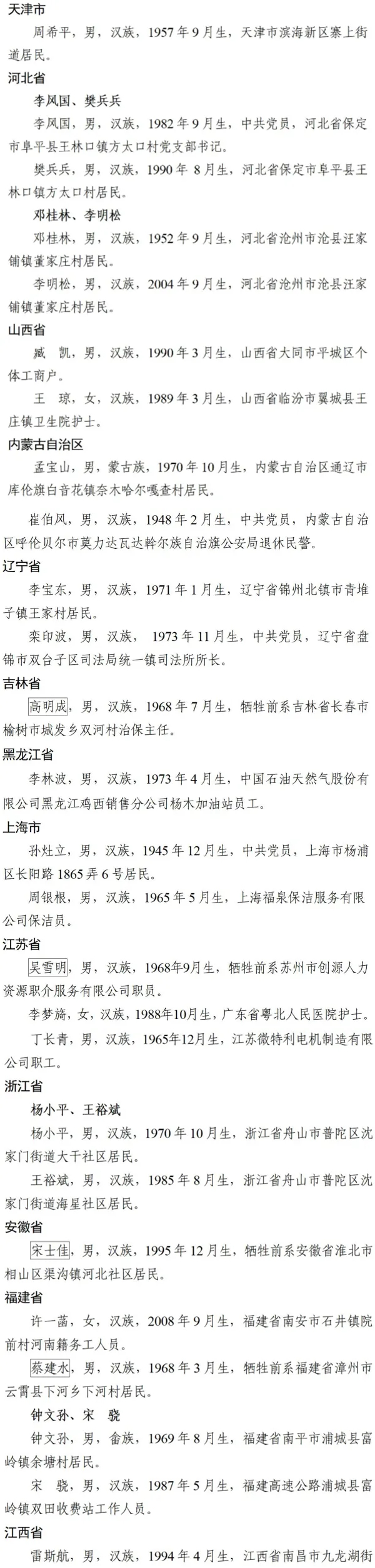 上榜的见义勇为勇士,有在汛期暴雨洪水中向险而行、抢险救出多人的李风国、樊兵兵、汤伟鹏、朱旭阳等;有在犯罪嫌疑人持刀行凶时挺身而出、英勇搏斗的崔伯风、高明成、许一菡、陈文彬、邹玉华等;有在深达40米低温缺氧井中救出幼童的女辅警布帕太姆·阿布杜喀迪尔;有第27批援坦桑尼亚中国医疗队队长张军桥为施救当地民众英勇牺牲,用生命践行中非人民友好精神。此次榜单中,吴雪明、宋士佳、蔡建水、吴秋钟、夏华、李静毅等11位勇士为保护他人生命财产安全献出了宝贵生命,让我们向他们致以崇高敬意!