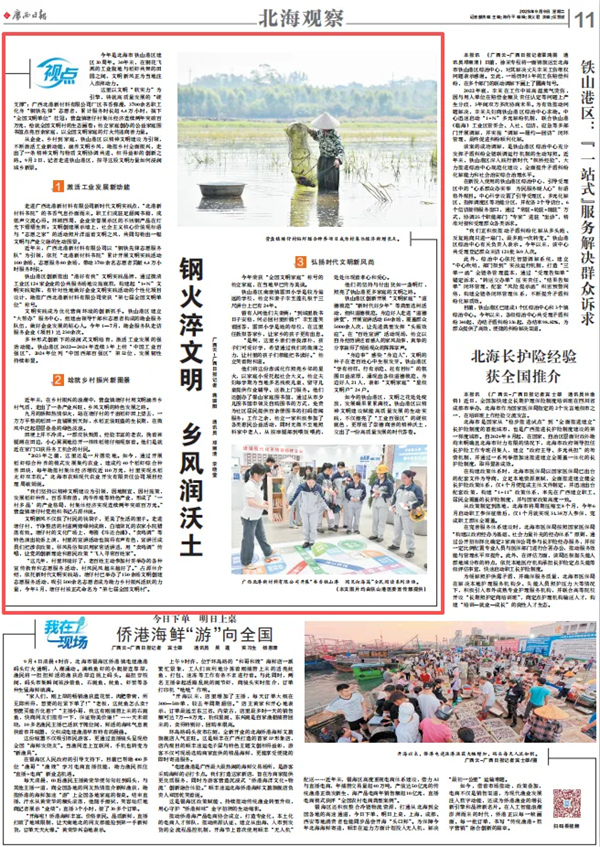 从企业、乡村到家庭,铁山港区以精神文明建设为引领,不断激活工业新动能,涵养文明乡风,助推乡村全面振兴,走出了一条精神文明与物质文明协调共进、相得益彰的创新之路。9月2日,记者走进铁山港区,探寻这股文明力量如何浸润城乡新景。