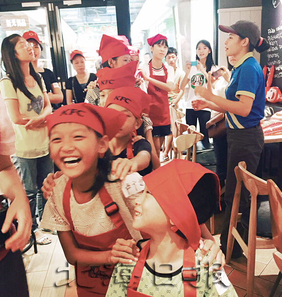 留守儿童在肯德基体验当“小厨师”,并开心享用肯德基大餐。 叶文媚 陆威 摄