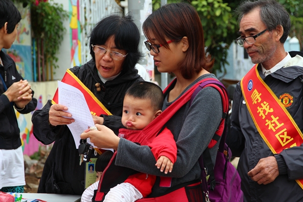 1日上午,66岁的山西老人建福和老伴与15名志愿者一起来到北海怡海新村,他们今年已经参加了十多次志愿服务活动了。当天,他们作为去年北海“寻找社区好邻居”活动参与小区的居民代表,同时也是志愿者,到今年新扩展的小区去宣传“寻找社区好邻居”的活动。与他们一样的老志愿者有将近50人,分散在当天活动的3个小区中。
