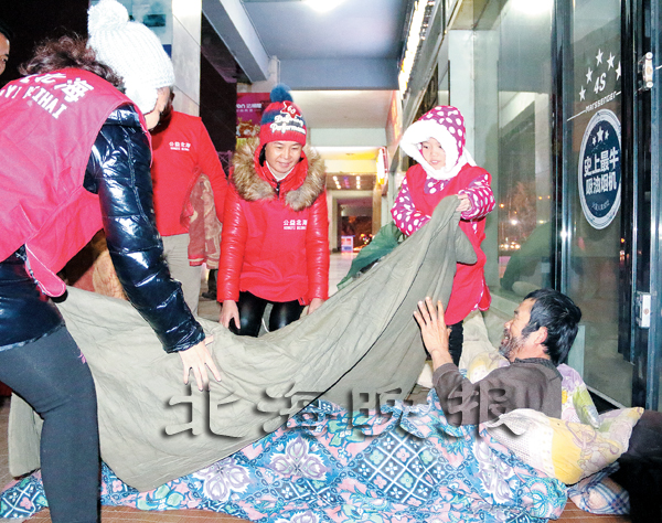 1月24日深夜,绝大部分市民都在家中躲避寒风,北海民间志愿者协会的16名志愿者带着20多床被褥和20多套御寒衣物,驾车穿梭在大街小巷,为露宿的农民工送上一份温暖。记者 方晓淦实习生 何建丽 摄