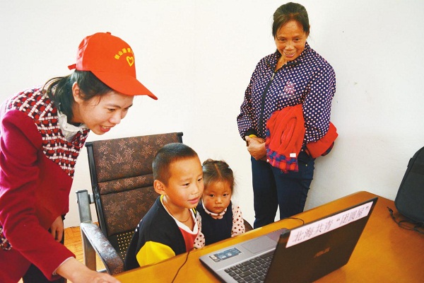 志愿者帮助留守儿童和父母视频对话。
