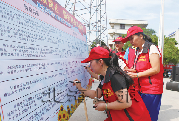 记者了解到,城市环境综合整治定岗类别有环境卫生整治岗、交通秩序监督岗、占道经营协管岗、农贸市场监督岗、户外广告监督岗、噪声污染监督岗、食品安全监管岗等。当天,该区86名社区党员根据各自实际情况,自愿认领了相应岗位。此外,当天,北海市中医院、海城区九小等5个单位率先签订了“市容环境门前三包责任书”,皇都美食、雅思特酒店等6个单位率先签订了“文明诚信经营承诺书”。