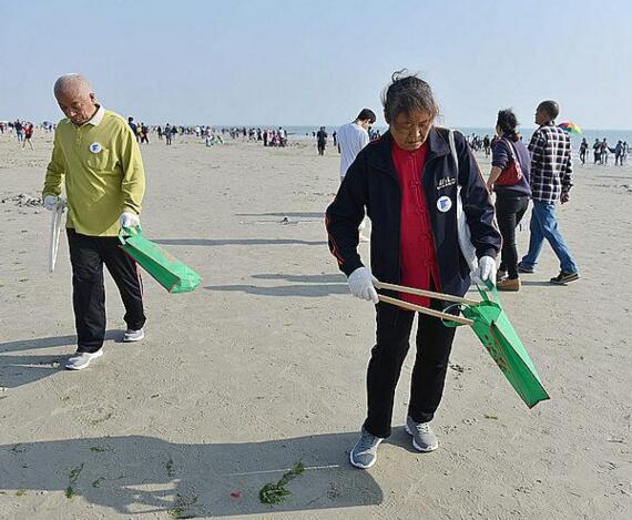 来自江西的“候鸟”唐爷爷,弯着腰,拿着竹夹,看到沙滩上的垃圾便夹起来,仔细地放到环保袋里装好。今年82岁的唐爷爷告诉记者,他来北海已有十多天了,平时最喜欢跟老伴在沙滩上散步,知道有这个公益活动,便和老伴一齐来参加,希望大家一起来?;ふ馄览龅暮L?。