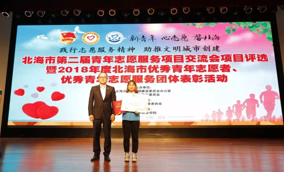 市民政局副局长廖达、北海职业学院副院长邱桂莲为荣获市青年志愿者优秀个人颁奖