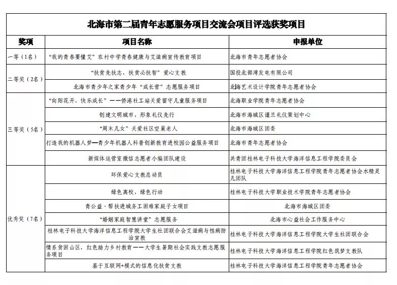 经过激烈的角逐,北海市青年志愿者协会的我的青春要懂“艾”——北海市农村中学校园防艾宣传服务项目获得一等奖。