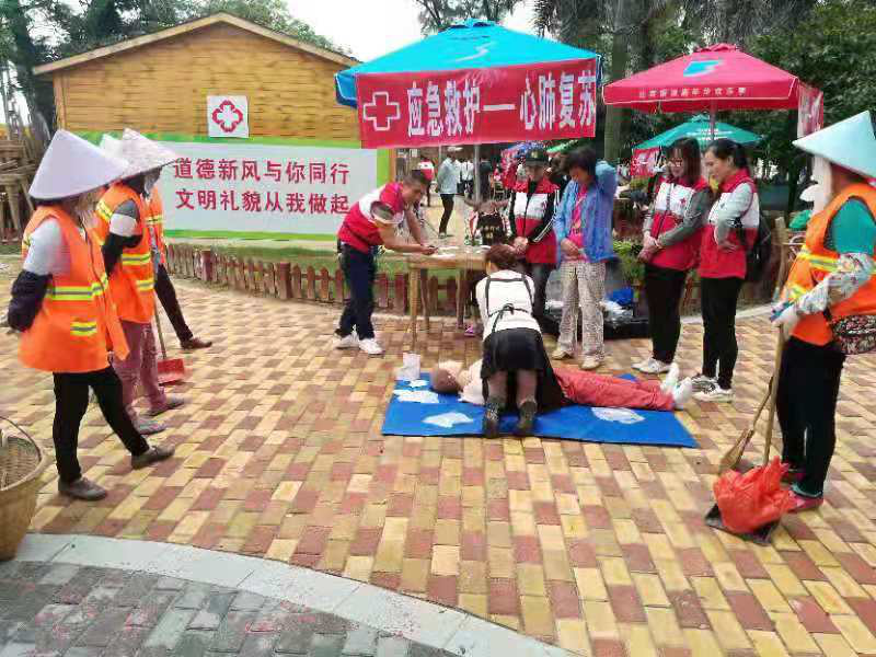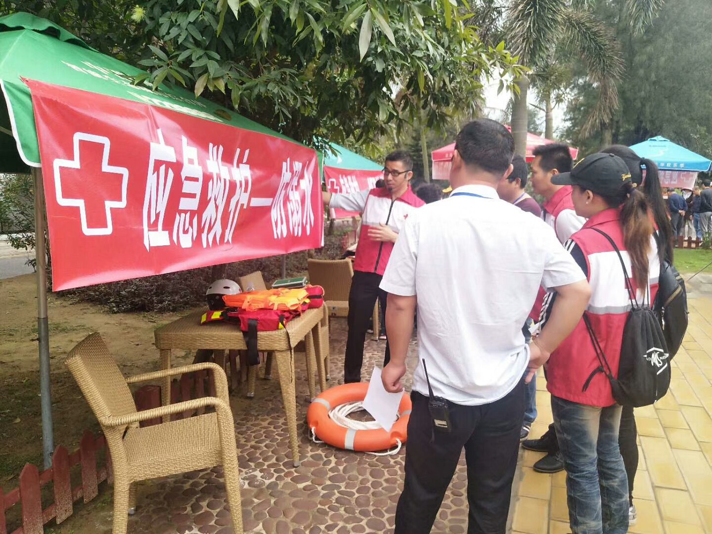 在银滩救护站,六名社区服务队员和红十字会师资队老师共同运用案例演示、示范等方式,利用人体模型现场为人们详细地讲解了防水、一氧化碳中毒、创伤及心肺复苏等知识,让人们学会遇到险情时如何评估自救和救人的正确方法,在关键时刻挽救生命。