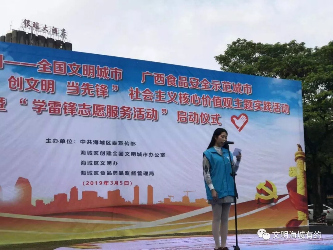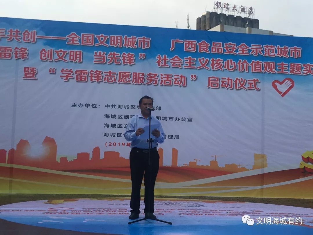 3月5日上午,由海城区委宣传部、区创建全国文明城市办公室、区文明办、区食品药品监督管理局共同主办的2019年“学雷锋、创文明、当先锋”社会主义核心价值观主题实践活动暨“学雷锋志愿服务活动”启动仪式在海门广场举行。