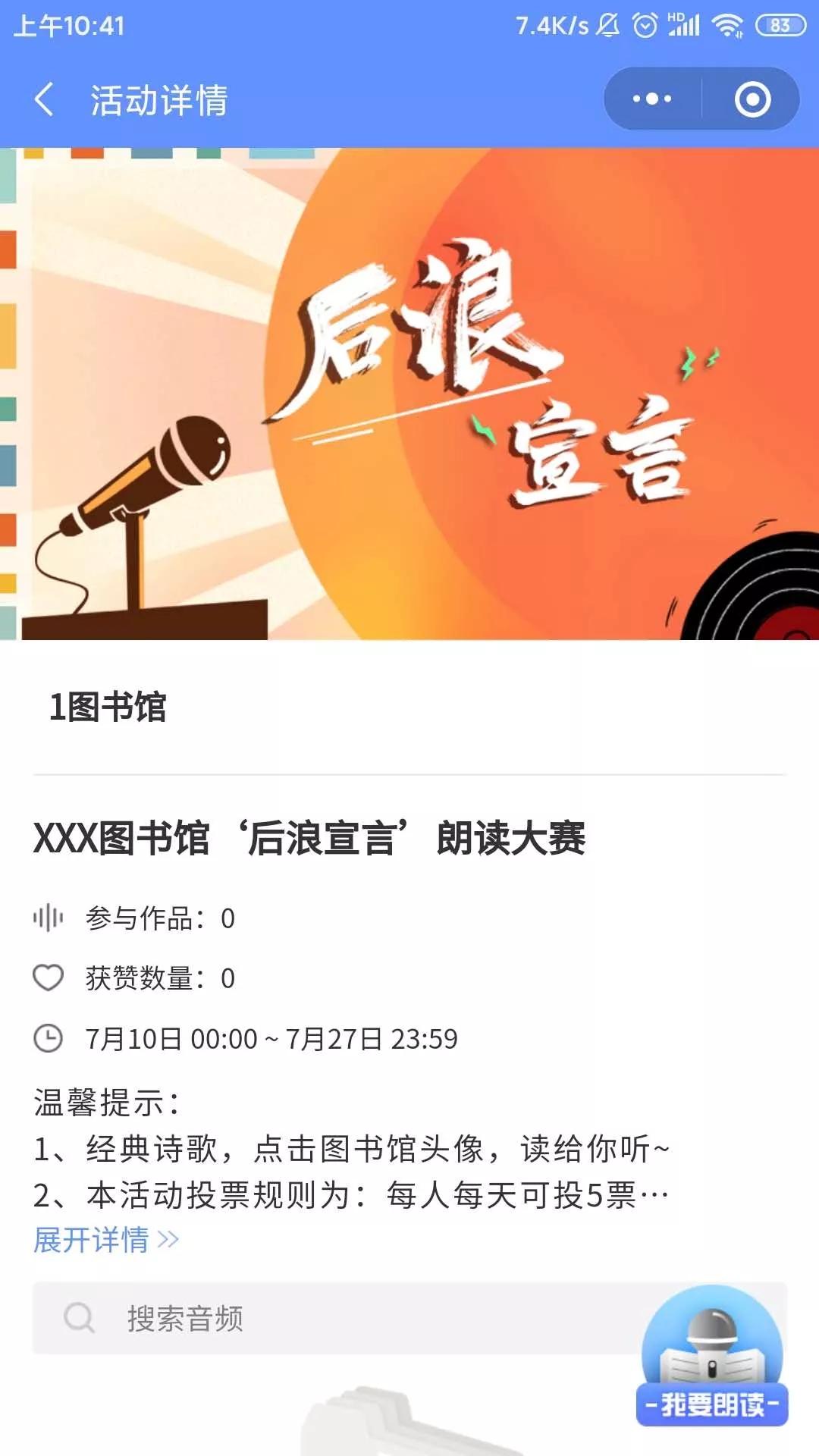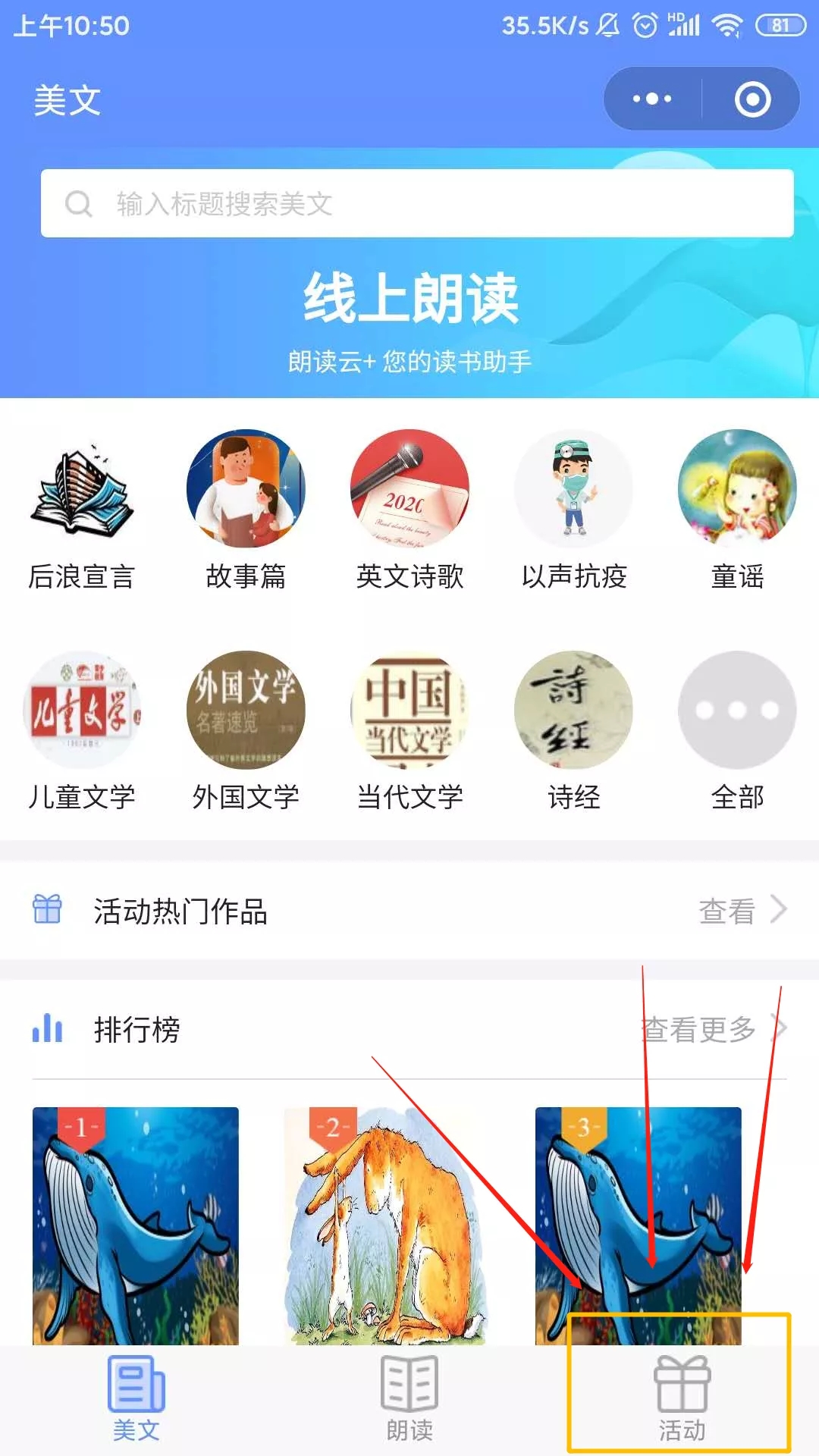(2) 朗读云小程序菜单栏选择“活动”,选择“「后浪宣言」新时代青年诵读大赛”主题活动;