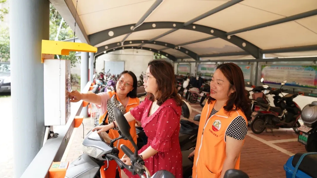 ▲6月24日, 南昌市青山湖区塘山镇高新社区“清风志愿者服务队”的成员在和苑小区指导居民使用电瓶车充电装置。新华社记者 胡晨欢 摄