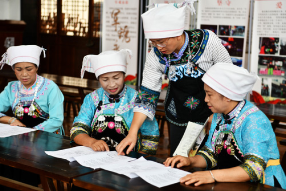 ▲在贵州省龙里县新时代文明实践中心,龙里县“金嗓子”志愿服务队队长罗丽萍(右二)在指导志愿者们学唱新时代文明山歌(2020年7月3日摄)。新华社记者 杨文斌 摄