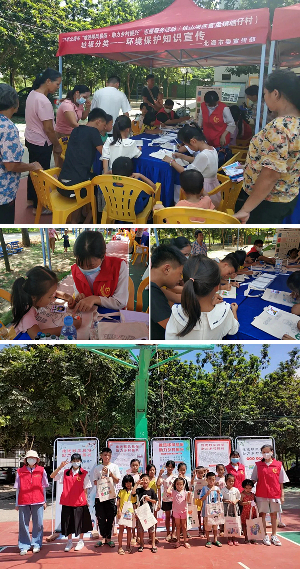 志愿者们在垃圾分类摊位帐篷里分发环保袋给孩子们,让孩子们用彩色画笔亲自动手为环保袋绘制上喜欢的色彩,环保袋上各式各样的环保宣传标语和图案在孩子们绘制的过程中一点点被印刻在脑海里,向村民和孩子们在生活中倡导循环使用环保袋,低碳生活,推动城市绿色健康发展,助力乡村振兴。