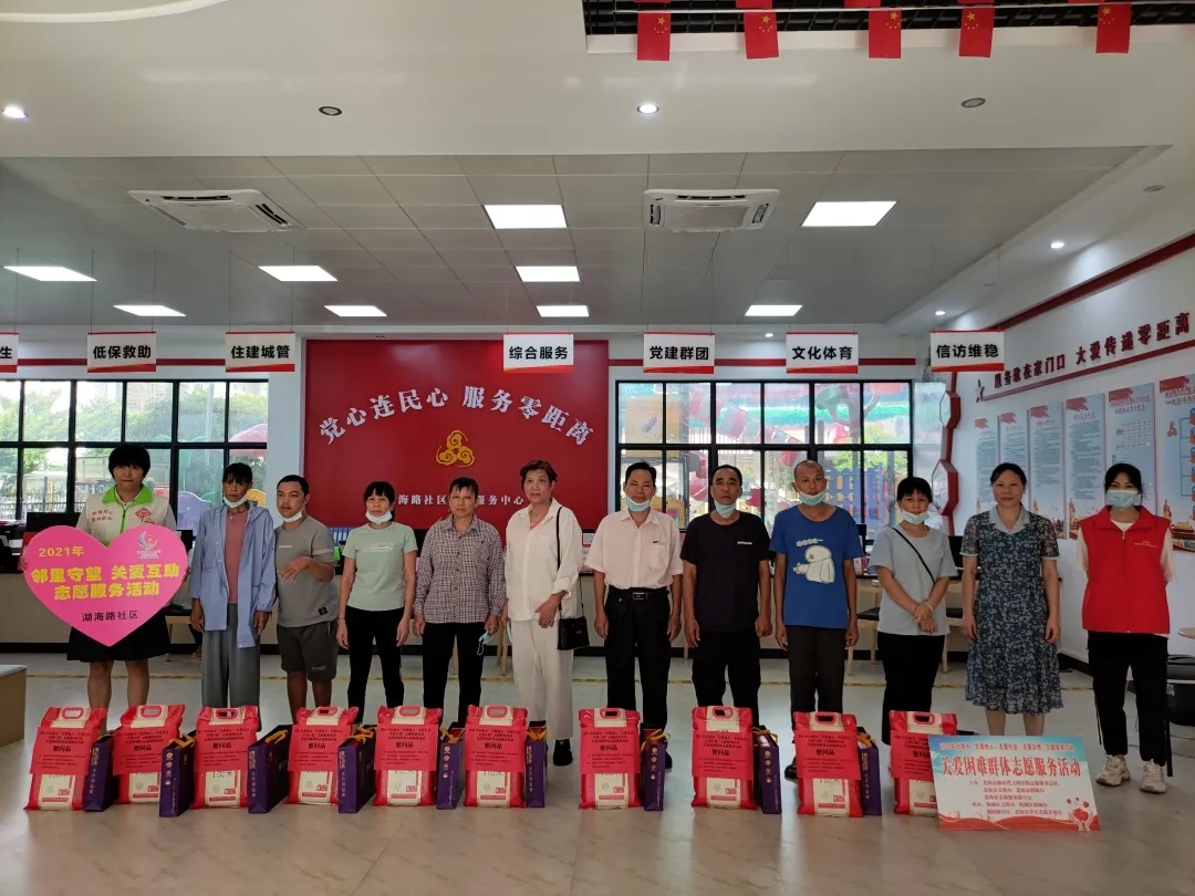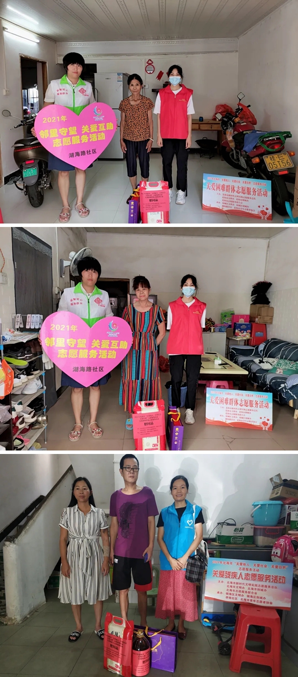 习近平总书记强调,不能让困难群众掉队。为让孤寡老人、残疾人、困境儿童等困难群体度过一个温暖、友爱的中秋佳节,由北海市新时代文明实践志愿服务总队、北海市文明办、北海市创城办、北海市志愿服务联合会主办,海城区文明办、银海区文明办、海城区创城办、银海区创城办,北海市青志协等承办的2021年北海市“关爱他人、关爱社会、关爱自然”志愿服务系列活动——关爱“困难群体”志愿服务活动在9月11日、9月16-18日分别走进了侨南社区、湖海路社区、北部湾东社区、福成社区,为困难群体家庭送去大米、花生油和月饼慰问品,给困难群体送去节日的祝福和关怀。
