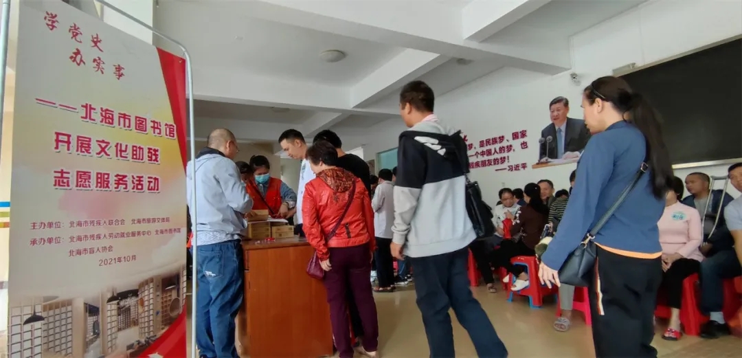 2021年10月15日是第38个国际盲人节,为大力弘扬文化志愿服务精神,丰富残疾人精神文化生活,传递新时代向上向善正能量,10月16日,北海市图书馆志愿者服务队到北海市残疾人联合会开展“学党史 办实事”文化助残志愿服务活动。