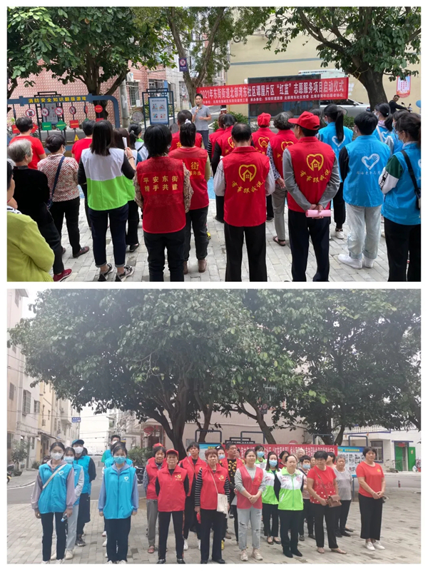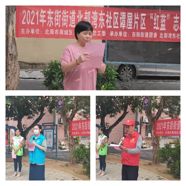 东街街道办事处主任龙光坤宣布东街街道北部湾东社区谭屋片区“红蓝”志愿服务项目正式启动,介绍了“红蓝”志愿服务队由“街巷红”和“青年蓝”组成,“街巷红”即北部湾东社区互联共建单位、街巷长、辖区党员志愿者,“青年蓝”即社会青年志愿者和大学生青年志愿者?!昂炖丁敝驹阜裎频辰?、创城、社会治理开展,主要项目包括:每月定期开展红色或新时代文明实践主题的观影活动、定期开展“红蓝服务周”志愿服务活动助力“星级文明户”评比。提出了“红蓝”志愿服务项目的成立初衷就是服务群众,街巷长要发挥谭屋街巷长制作用,做群众心声的“传声筒”,青年志愿者和党员志愿者要切实为民做好事办实事,带领群众做街巷的文明先锋。