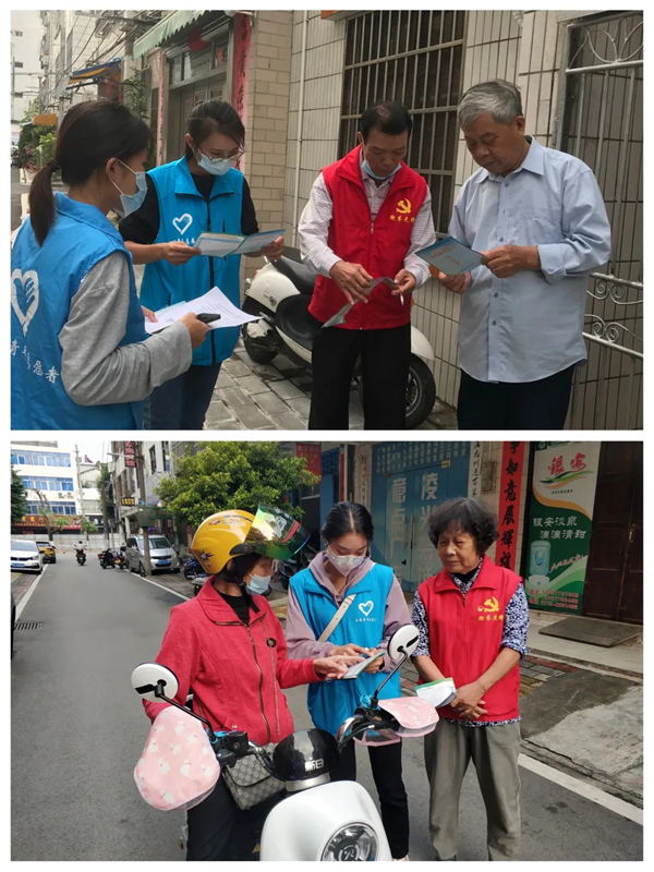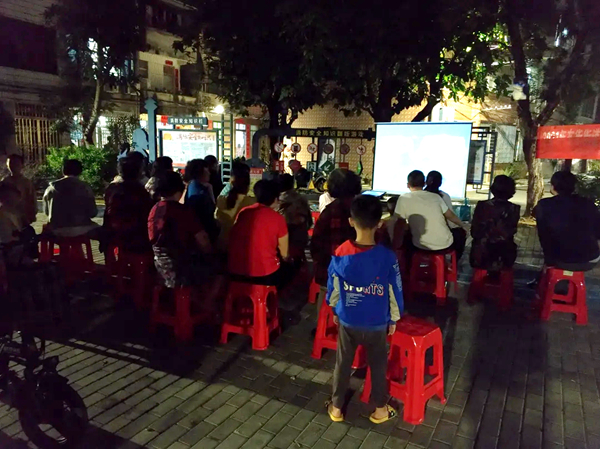 在启动仪式结束后,立即组织了首次“红蓝志愿周”活动,32名志愿者们兵分8组到谭屋片区开展了创城和城乡居民基本养老保险参保征缴宣传,耐心向群众普及知识、政策和参保事项。当晚还举办了首次“红色观影”活动,在谭屋消防小广场,播放了《悬崖之上》,在加强党史教育、红色教育的同时,进一步丰富辖区群众的精神文化生活。