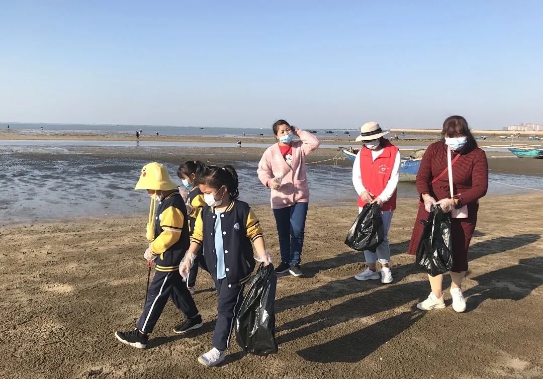 下午三点,参与本次社会实践活动的家长和小朋友首先在讲解员的带领下参观高德古镇。参观完高德古镇后,在老师的带领下,家长及孩子们排队进入海滩,在浅滩沿途清理垃圾。