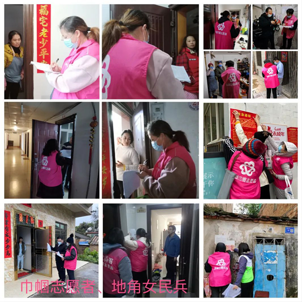 地角女民兵连主动请缨,以网格为单位逐户逐人摸排登记,核实住户信息,做到“不漏一户,不漏一人”,参与女民兵20余人,走访1300余户,张贴紧急通知40余份。西街街道出动巾帼志愿者200余人次参与疫情防控排查工作,开展“社区包小区、小区包人”地毯式疫情防控排查及宣传,遍访1万余人次。