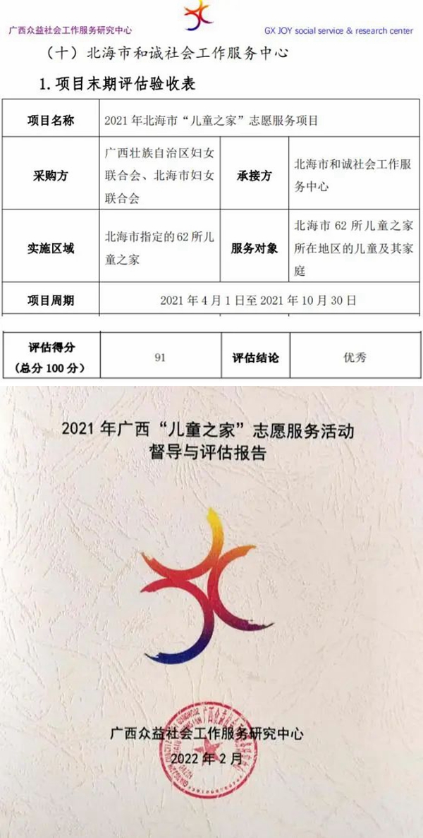 项目完成后,由广西众益社会工作服务研究中心进行实地评估和线上评估,北海市和诚社会工作服务中心承接的北海市“儿童之家”志愿服务项目以91分评估分数获评优秀项目称号!