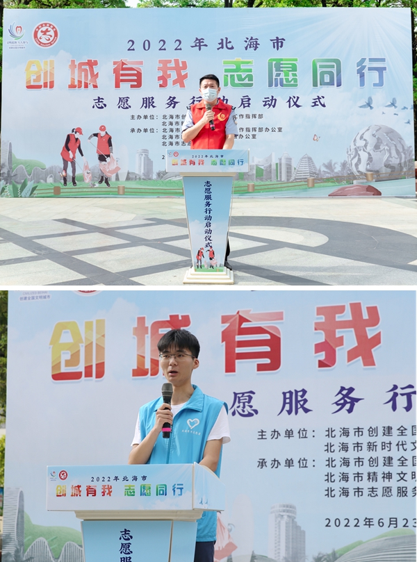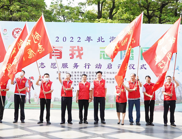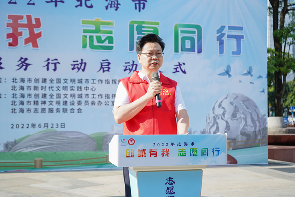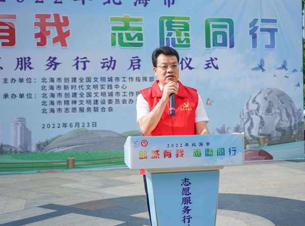 市委常委、宣传部部长刘伯贤同志宣读《2022年北海市“创城有我 志愿同行”志愿服务行动倡议书》。倡议:志愿同行,做遵规有礼的引导者;志愿同行,做爱心力量的传递者;志愿同行,做文化传承的记录者。