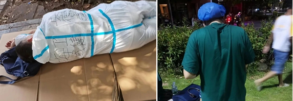海城区疾控中心朱德强长时间驻扎在点位上,体力不支,累倒在地,试了几次爬不起来,群众拿来凉席,劝他就地休息,缓和一点后,又继续起来战斗。