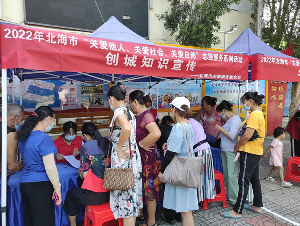 为充分发扬“奉献、有爱、互助、进步”志愿精神,营造人人关心创城、支持创城的良好氛围,助力北海市创建全国文明城市,9月7日上午,由北海市新时代文明实践志愿服务总队、北海市文明办、北海市创城办、北海市志愿服务联合会主办,北海市银海区侨港镇侨南社区、北海市青年志愿者协会承办的2022年北海市“关爱他人、关爱社会、关爱自然”系列志愿服务活动在侨南社区侨港文体公园开展,100余名居民参与活动。