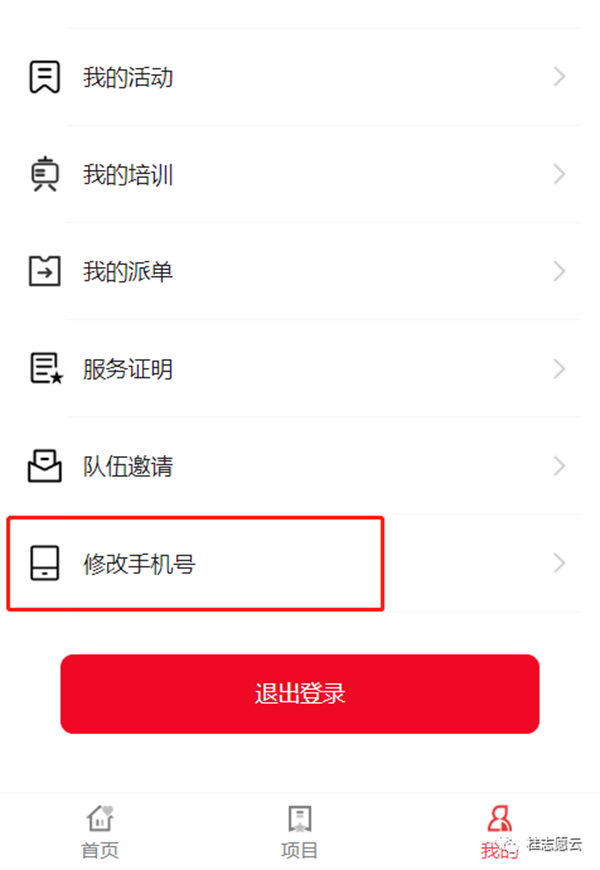 操作步骤:志愿者登录后,在个人中心页面拉至底部,点击“修改手机号”。