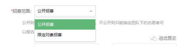 注:“公开招募”允许所有志愿者报名,“限定对象招募”仅限本团队成员及所选择的团队成员报名,可最多选择10支团队。