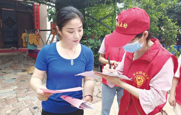 ▲“三文明”志愿服务队到银湾社区开展创城入户宣传活动。(北海市教育局供图)