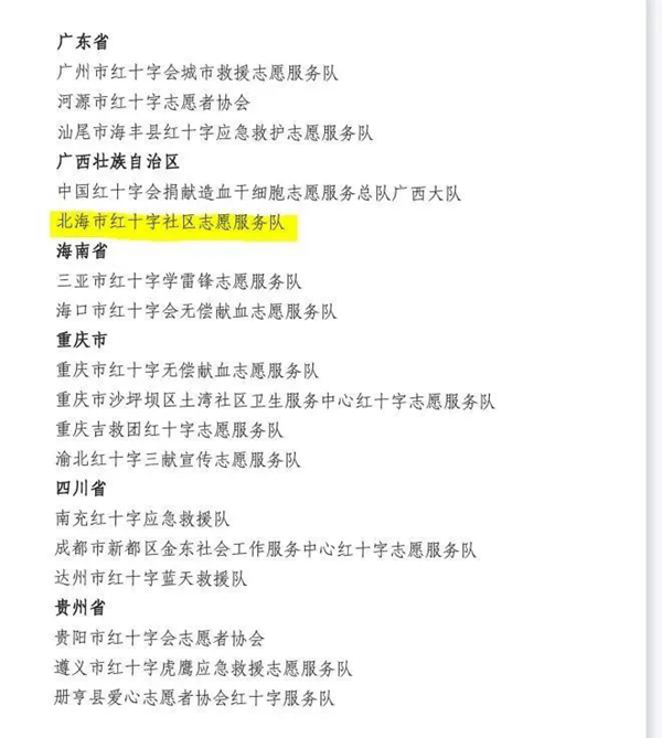 11月15日,全国红十字模范单位表彰名单出炉,广西11个单位和组织榜上有名。其中,北海市红十字社区志愿服务队成功入选,广西仅有2个红十字志愿服务组织上榜。