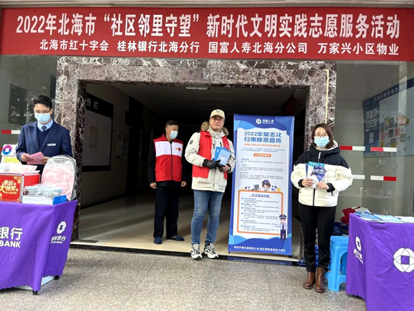 近日,国富人寿北海分公司联合北海市红十字会、桂林银行北海分行、万家兴小区物业开展主题为“社区邻里守望”新时代文明实践志愿服务活动,向社区居民普及金融知识,提高社会公众金融知识水平、金融风险意识和自我?;つ芰?。以实际行动弘扬和践行“奉献、友爱、互助、进步”的志愿精神,受到社区居民赞誉和好评。