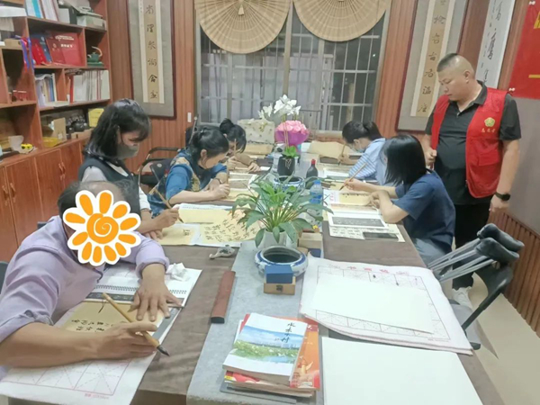 ▲钱宗文(右一)为残疾人朋友及其他群众免费教授书法。