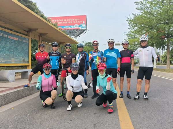 ▲刘伟(左二排第三)及其自行车队在环北海骑行。