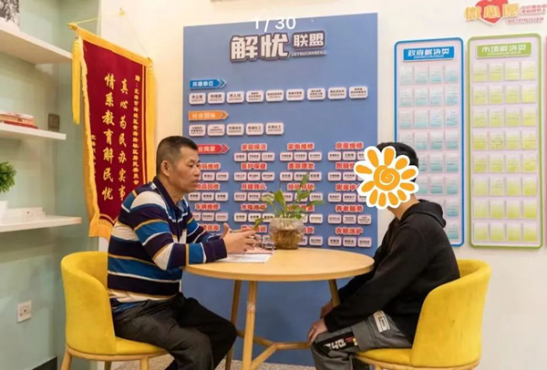 ▲陈家强(左一)现场了解残疾人基本情况,并帮其办理进入日间照料中心资料。
