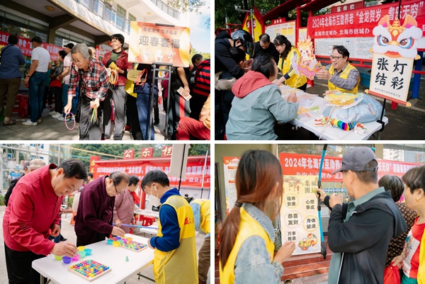 在志愿者的指引下,老人们大显身手,认真投入每个游戏环节。有充满年味的做灯笼、剪窗花环节,让老人与传统艺术进行了一次亲密接触,有锻炼老人手部灵活能力的“年年有鱼”“双龙戏珠”游戏,还设置了考验眼力和耐心的套圈、射箭等小游戏,在娱乐中传递健康运动的理念。