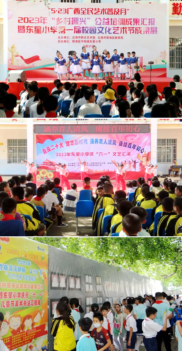秉持一份信念,8年风雨兼程。2016年以来,北海市群艺馆在东星小学常态化开展文化志愿服务活动,在乡村播撒艺术的种子,常年开展音乐、舞蹈、美术、书法、非洲鼓等艺术培训志愿服务,让乡村孩子共享城市优质的艺术教育资源。每年“六一”期间开展培训成果汇报展演,提高孩子们的艺术展演水平、自信心和表达能力等综合素养,至今已累计开展艺术培训及演出展览等文化志愿服务近700次,受益学生近2万人次。通过8年的文化志愿服务,东星村的孩子们对文化活动的参与由被动变为主动,个人文化艺术素养和舞台表现力明显增强,生活和学习更加自信、乐观、积极向上。