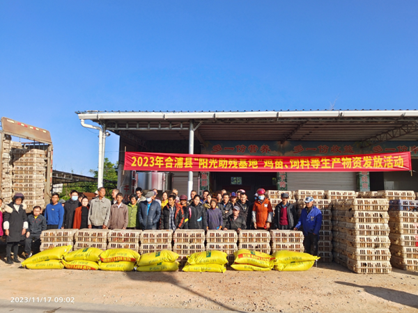 种养式造血项目。与农业合作社(或种养大户)合作,建立农村残疾人“阳光助残基地”,扶持残疾人生产。在2023年海城区高德街道“阳光助残基地”生产物资发放活动现场,为120户残疾人家庭发放鸡苗6000羽、饲料9600公斤,有效提升残疾人家庭自我发展能力。