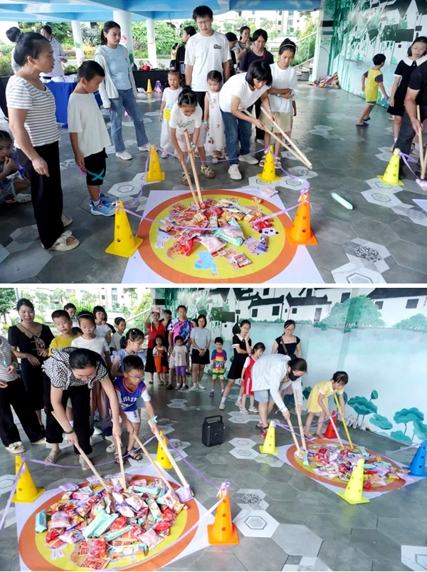 “30秒夹零食”气氛紧张热烈。家长和孩子手持长筷紧盯零食,社工一声令下迅速夹取。计时结束,满盘零食成为努力的见证,孩子们兴奋地分享战利品,成就感满满。