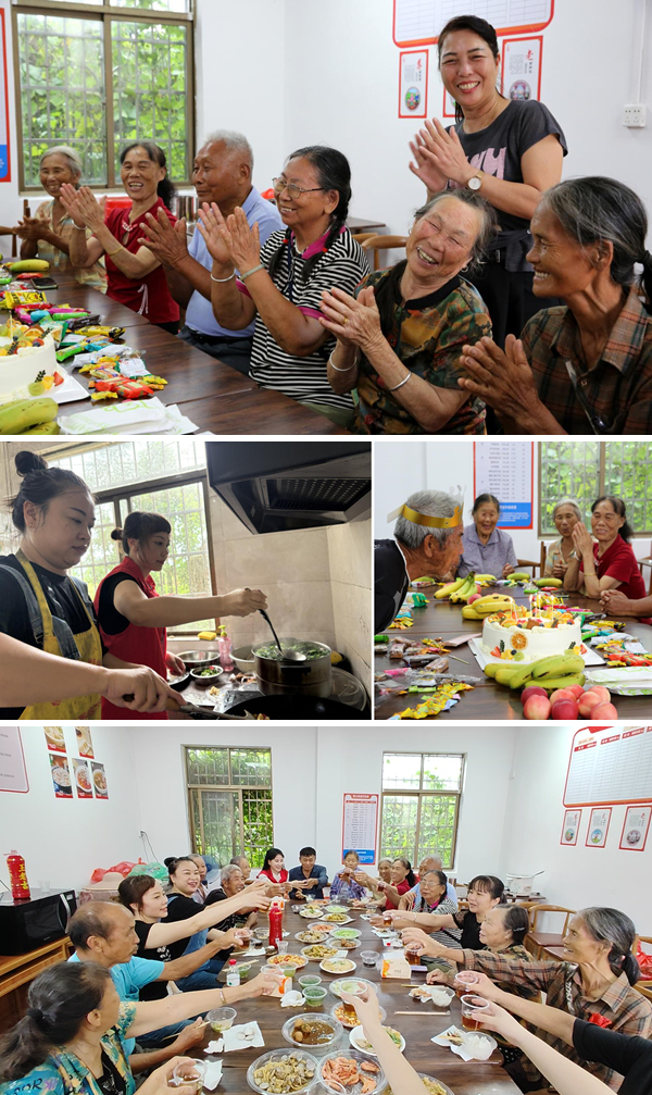 厨房内,志愿者精选本地当季食材,烹制酸菜焖扣肉、番茄炒鸡蛋、白切鸡、红烧肉丸等家常菜肴;饭桌上,他们化身“家人”,用方言陪老人唠家常、问冷暖,并为第三季度生日的老人举办集体生日会,欢声不断。