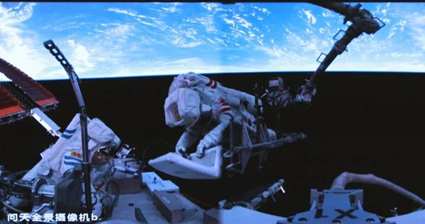 这是2025年6月26日在北京航天飞行控制中心屏幕上拍摄的神舟二十号航天员陈冬(左)与陈中瑞在空间站组合体舱外工作的画面。来源:新华社