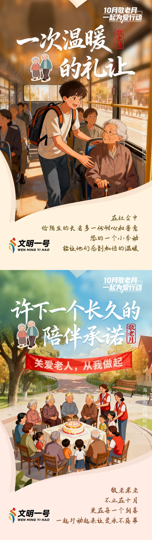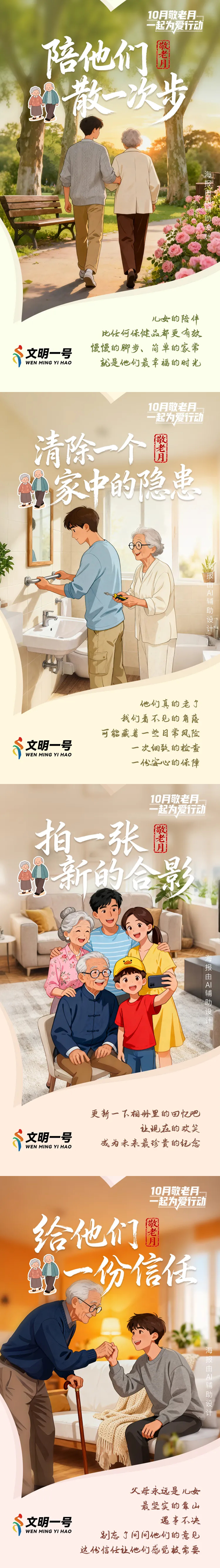 2025年10月10日至31日,全国“敬老月”活动主题为:弘扬孝亲敬老美德,共建老年友好社会。敬老爱老、养老护老是全社会应尽的共同责任,让我们一起为爱行动,弘扬中华民族孝亲敬老传统美德,形成尊老敬老爱老的社会风尚。做好这10件小事,让爱不缺席。这个10月,让我们用行动表达爱,让关怀不止在敬老月更融入每一天的生活。无论是陪伴年迈的家人还是关爱身边陌生的长者,每一份善意都是共建老年友好社会的一份力量。孝亲敬老,是传统美德,更是时代风尚。让我们一起,为爱行动,让温暖延续!