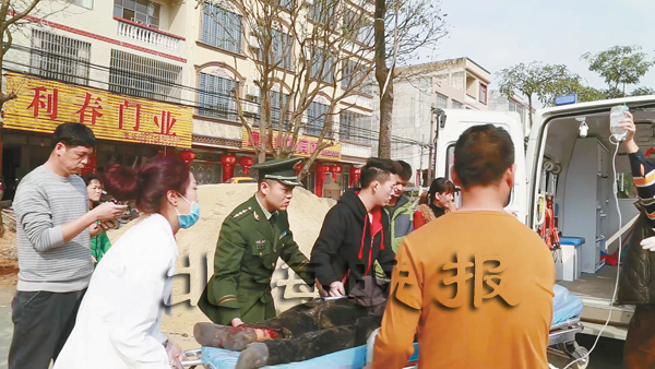 梁晓与救援人员一起将伤者送上救护车。 窦军 摄