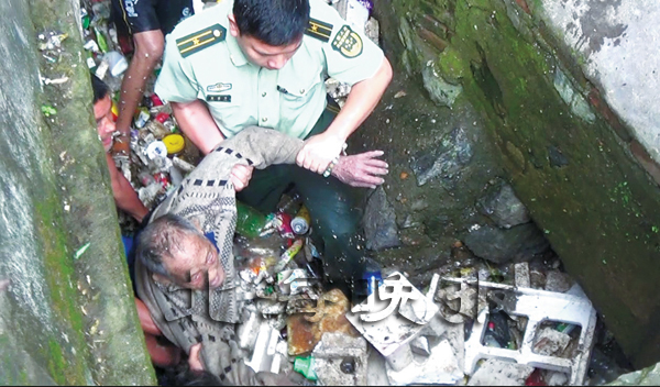 当日,公馆边防派出所民警接到群众报警,称有一名老人钻到某街道下水管道里不肯出来。民警接报后立即前往现场处置。在镇上一条穿街而过的下水道里,民警发现一个浑身发抖的老人蹲在那里。由于刚下过暴雨,下水道的水位不断上涨,为尽快将老人从下水道中救出来,民警跳入满是垃圾的下水道中,一步一步靠近老人。为防止老人因害怕而往下水道的深处走去,民警一边向前探路,一边安抚老人。最后,在群众的帮助下,民警终于将老人从下水道中扶了出来。