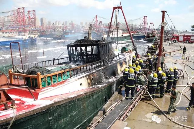 (渔船中部被严重烧毁)
