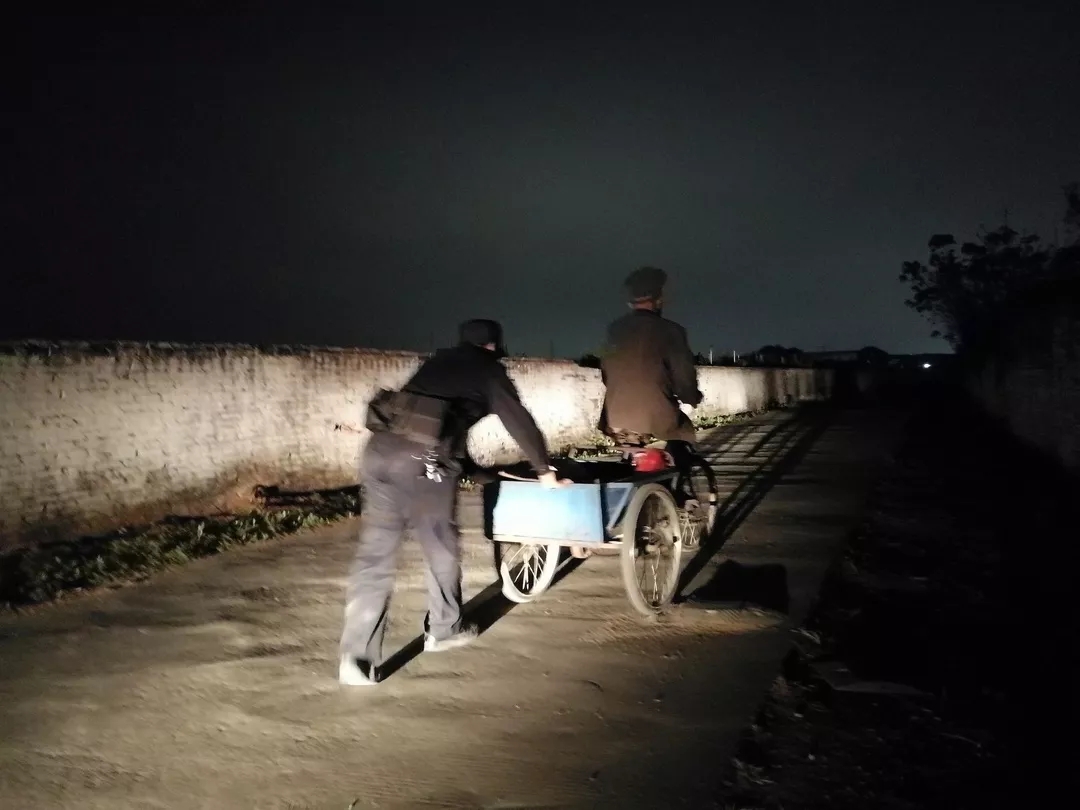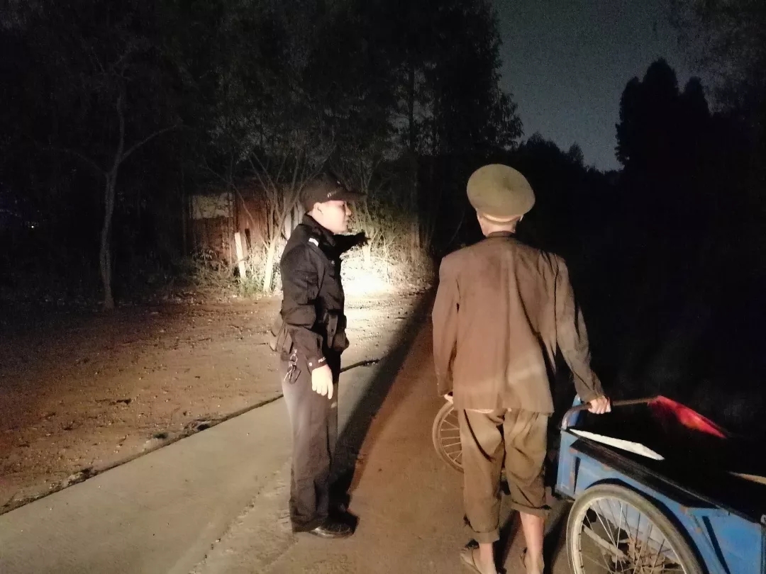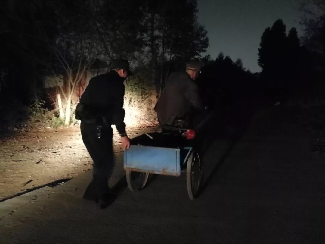 为了让老人平安顺心回家,民警决定开着警车为老人照亮回家路。一路上,老人骑着三轮车,警车开着警灯紧紧跟随,为老人照明,民警扶着车身,在后面为老人推车,渴了给老人喝点水,累了陪老人在路边稍作休息,沿途不时询问过往的群众,进一步确认老人的住址,最终历时近2个小时、十多公里路程后,将老人平安送回家中。