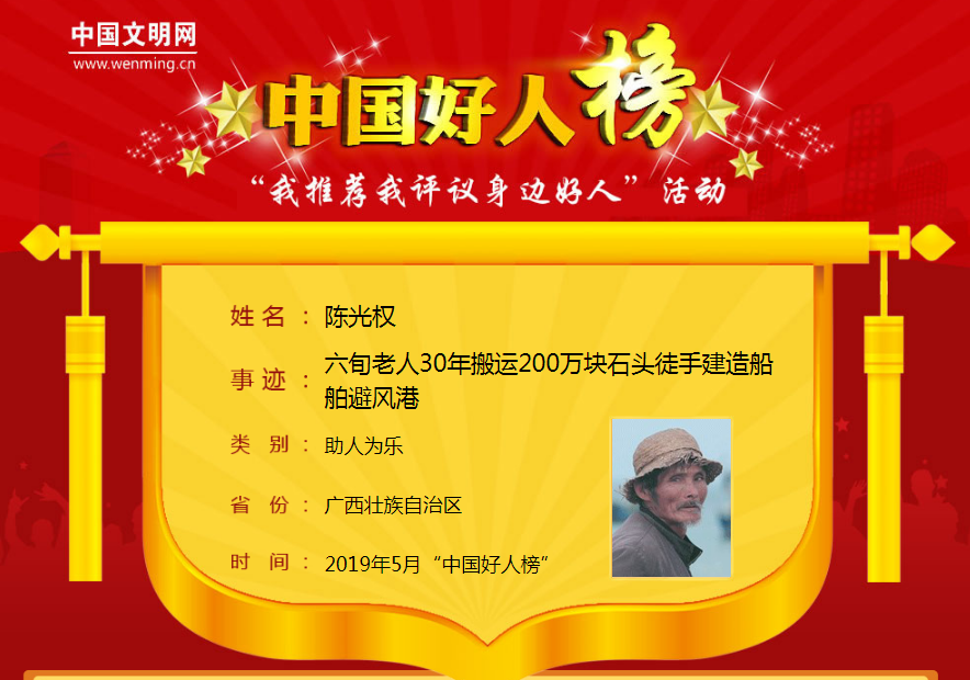 陈光权为了渔民能够安全出海捕鱼、为了打渔回港的渔船能有躲避风雨的地方、为了维护渔民的身边利益,义无反顾当起了现实版“愚公”,用了30年的时间,搬运了200多万块石头,徒手建造船舶避风港——“马拉港”。