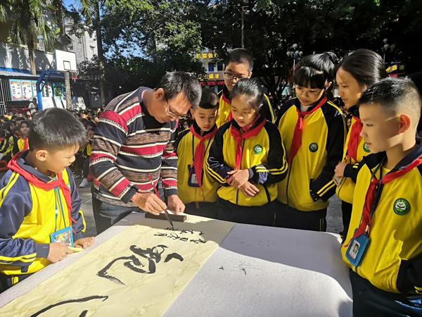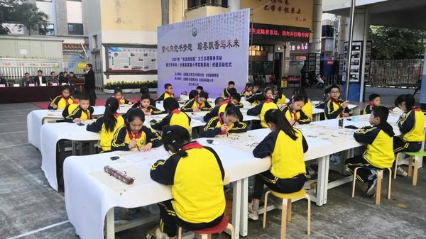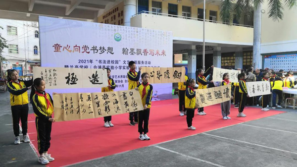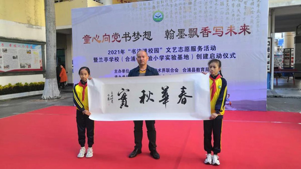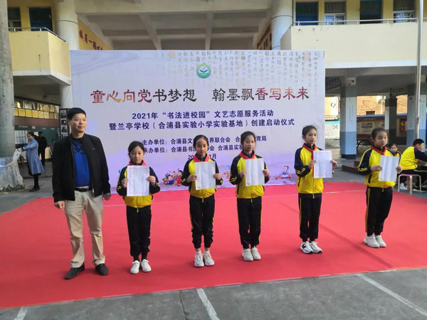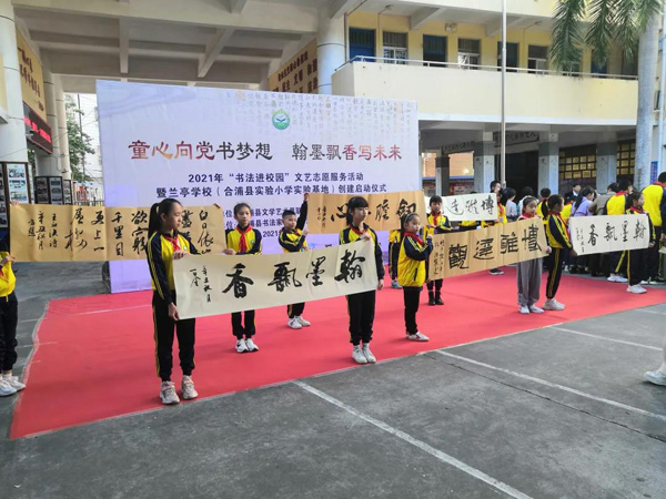 11月9日,合浦县文学艺术界联合会联合合浦县教育局在县实验小学举行“童心向党书梦想 翰墨飘香写未来”——2021年“书法进校园”文艺志愿服务活动暨兰亭学校创建工作启动仪式,进一步规范学校的书法教育工作,提高广大师生书法水平,营造弘扬和践行中华传统文化的良好氛围。