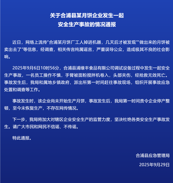 9月29日,北海市合浦县应急管理局发布《关于合浦县某月饼企业发生一起安全生产事故的情况通报》,全文如下: